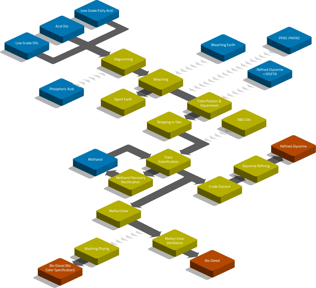 Процесс производства биодизеля на заводе по производству биодизеля или заводе по переработке биодизеля заключается в добавлении метильной/этильной группы к алифатическим цепям растительных масел или животных жиров, что придает им свойства, аналогичные дизельному топливу. Это достигается химической реакцией липидов (например, растительного масла, жирных кислот, животного жира и использованного кулинарного масла) с алкоголем (метил/этил), в результате чего образуются эфиры жирных кислот. Этот процесс может быть реализован на различных типах заводов, таких как завод по производству биодизеля из джатробы, завод по производству биодизеля из каранжи, завод по производству биодизеля из махуа, ферментативный биодизель, биодизель в непрерывном смесительном реакторе или завод по производству биоэтанола с множеством исходных материалов (B100).