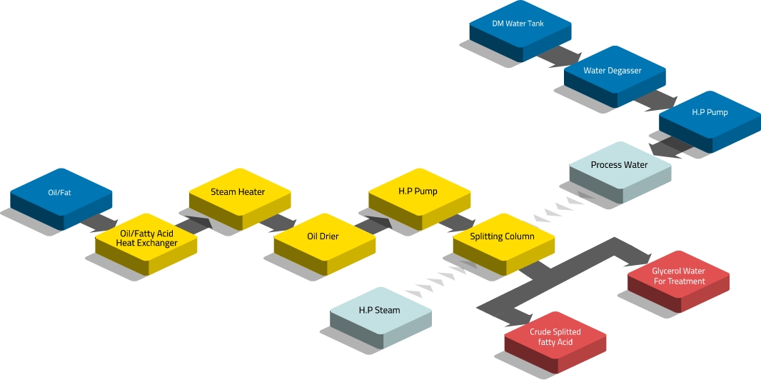 Механизм этой реакции проходит три этапа - триглицерид последовательно превращается в диглицерид, моноглицерид и глицерин, освобождая на каждом этапе жирную кислоту. Компания Mectech построила несколько заводов для термического расщепления жиров и масел под давлением с водой в жирную кислоту и глицерин. Это простой экономичный процесс, не загрязняющий окружающую среду. Mectech поставляет установки для расщепления жира производительностью от 30 до 1000 TPD.