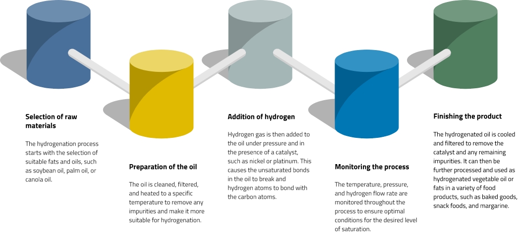 Гидрогенизация жиров и масел - это процесс, при котором к ненасыщенным жирам и маслам добавляется водород, в результате чего образуются насыщенные жиры. Этот процесс широко используется в пищевой промышленности для улучшения стабильности, текстуры и вкуса различных продуктов.