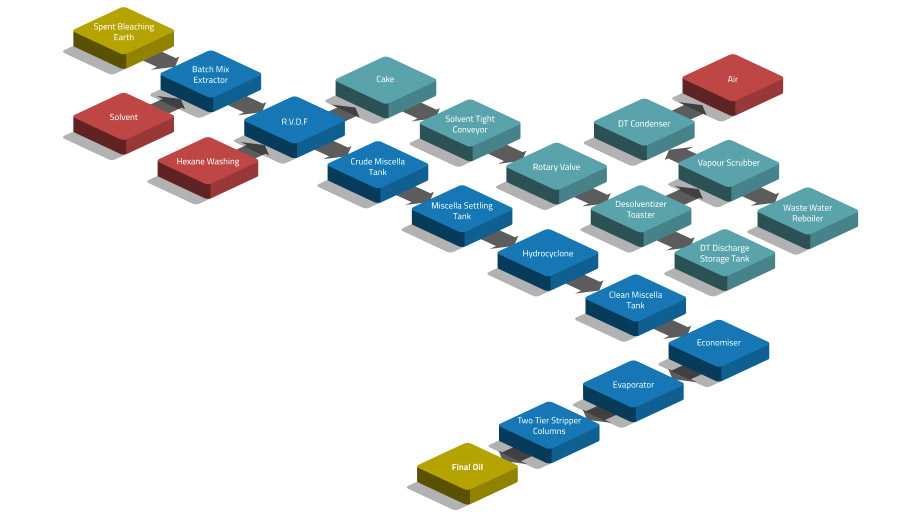 Типичный процесс физического восстановления растительного масла включает в себя дегуммирование сырого растительного масла, такого как пальмовое масло, для удаления камедей и фосфадов путем гидратации фосфорной кислотой, которая затем отделяется в виде мыльного раствора. Это снижает содержание фосфатов в масле примерно до 20ppm. Затем это масло отбеливается с помощью активированной глины, чтобы ослабить цвет масла и, что более важно, удалить пероксиды, остатки камеди и мыла, которые все еще существуют, несмотря на предварительный процесс сепарации. В таких отраслях, как переработка сырого пальмового масла, образуются большие объемы отработанной глины, и существует острая необходимость в экономичном восстановлении масла в отработанной глине.